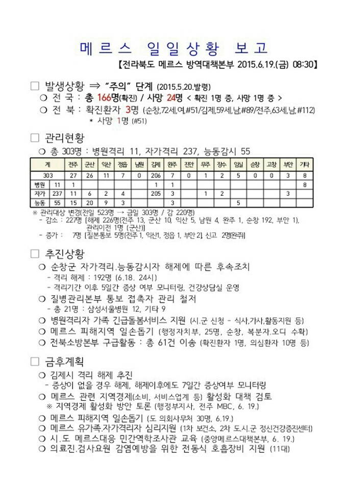 또 전북도 메르스 관리대상자는 이날 오전 11시 현재 병원격리 11명, 자가격리 237명, 능동감시 55명으로 총 303명이 관리되고 있으며, 남원시, 진안군, 순창군, 고창군은 메르스 청정지역이 됐다.