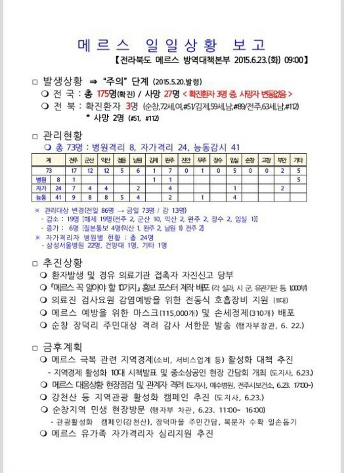 한편 23일 전북지역 메르스 관리대상자 수는 73명으로 전날보다 13명이 감소했다. 병원격리 8명, 자가격리 24명, 능동감시 41명 등이다.