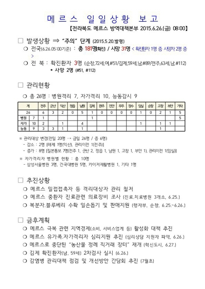 "남원지역 메르스 자가격리 관리대상자 스스로 적극적인 도움을 주고 있습니다. 자가격리가 해제될 때까지 대책본부 지시를 따라주시는 시민의식에 감동하고 있습니다."
