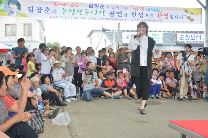 가수 김장훈이 참여한 '힘내라 순창경제 토요시장 장터음악회'가 지난 11일 순창전통시장 특설무대에서 관광객과 지역주민 500여 명이 참여한 가운데 화려하게 펼쳐졌다.