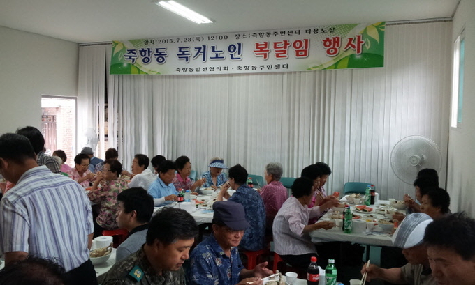 남원시 죽항동 발전협의회(회장 권태호)는 지난 23일 중복을 맞아 지역어르신들을 초청 새벽부터 정성스럽게 준비한 삼계탕을 독거노인 60여 명에게 대접하는 복달임 행사를 가졌다.