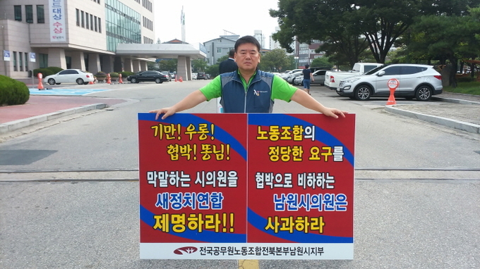한편 남원시공무원노조는 시민사회단체와 함께 시청 담에 게시한 시의원의 막말발언 성토 현수막을 시가 철거하자 강하게 반발, 현수막을 다시 내건데 이어 지난달 24일부터 시청 정문앞에서 아침 선전전을 통해 항의 시위집회를 지속하고 있다. /박영규기자ygparknw@hanmail.net