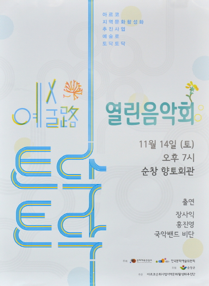 오는 14일 토요일 순창군 향토회관에서는 다양한 장르의 인기가수들의 공연을 만나볼수 있는 ‘예술路 - 토닥토닥- 토닥토닥'콘서트가 열린다.