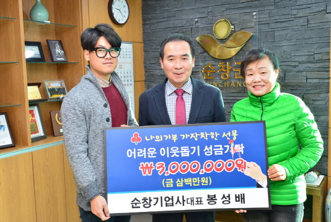 순창기업사 봉성배 대표가 8일 어려운 이웃을 위해 써달라며 순창군청에 300만원을 기탁했다.