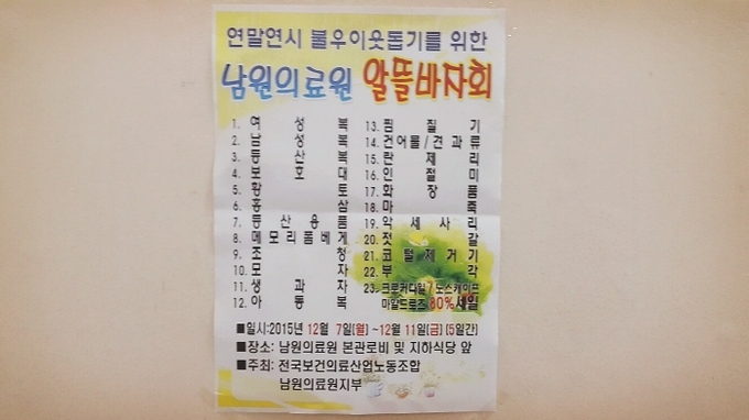 이 바자회는 전국보건의료산업노조 남원의료원지부가 주관한 행사로 의료원측은 노조의 협조요청에 장소를 제공하는 방식으로 진행됐다.