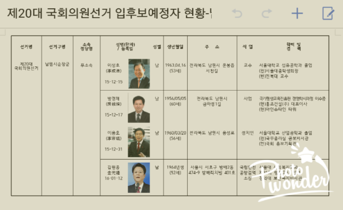 이번 총선 예비후보들의 다양한 직업군도 유권자들에겐 관심의 대상이다. 법원지원장부터 향우회 회장, 농민, 변호사, 복지전문가, 정치인 등이 거론되고 있다.
