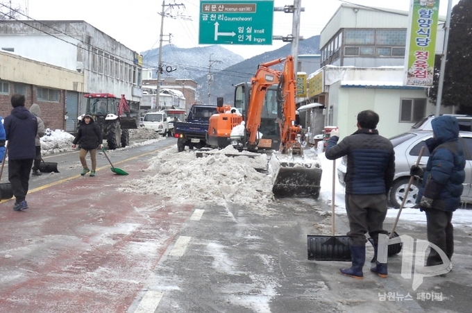 최근 순창지역에 평균 15.7cm의 적설량을 기록한 가운데 구림면 자율방재단40여명이 굴삭기 2대와 트랙터 2대 등 중장비를 동원해 구림면 소재지와 연산 치천방향 연산 화암방향 도로 제설 작업에 구슬땀을 흘렸다.