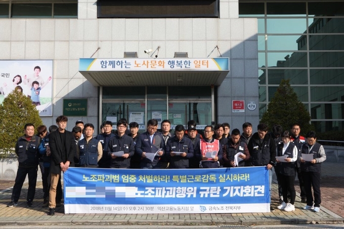 14일 전국금속노동조합 전북지부는 익산고용노동지청 앞에서 기자회견을 열고 “노조파괴행위를 자행하는 A업체에 대해 특별근로감독을 즉각 실시하라”고 촉구했다.