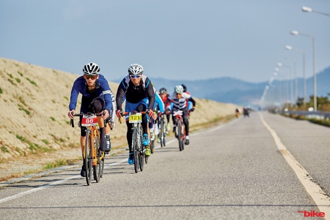 ▲지난달 25일 전남의 멋드러진 해안도로를 따라 즐기는 제11회 진도 해안도로 전국 자전거 랠리 대회에서 번외 선수로 출전한 동신스캇팀 정명환(남원성원고1) 선수가 선두를 질주하고 있다. /진도군자전거연맹