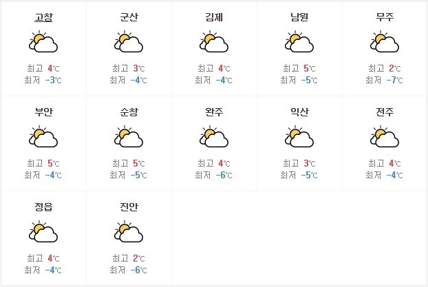 11일 아침 최저 기온은 무주가 영하 6도, 진안과 장수, 임실이 영하 5도, 남원과 완주, 순창, 익산이 영하 4도, 군산과 부안, 고창이 영하 3도, 전주와 정읍, 김제가 영하 2도 등의 분포를 보이겠고 낮 최고 기온은 영상 6도에서 8도로 다소 높아지겠다.