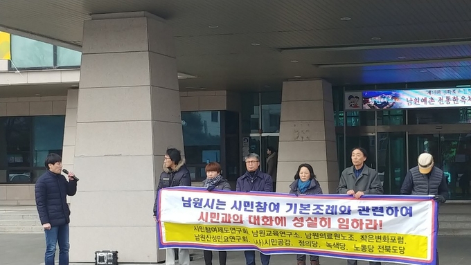 지난 9일 전북 남원지역 시민단체인 시민참여제도연구회는 남원시청 앞에서 기자회견을 열고 “시민들이 수개월동안 토론을 거쳐 민주적으로 확정한 시민참여기본조례안을 존중하고 시민들과 소통을 통해 조례를 제정해야 한다”고 주장했다.
