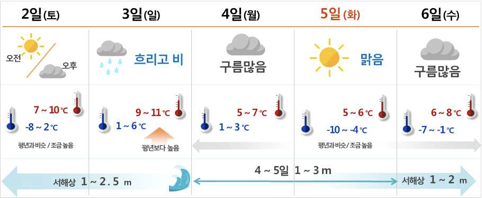 그러나 2일과 5일은 대체로 맑은 가운데 내륙지방을 중심으로 복사냉각으로 인해 아침 기온이 영하 10도 내외로 떨어지는 곳이 있겠고 낮에는 일사로 인해 4도 이상 오르면서 낮과 밤의 일교차가 크겠다.