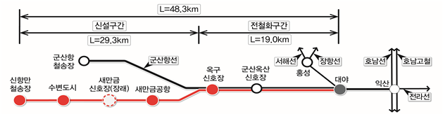 ‘새만금항 인입철도’는 전북 군산 대야에서 새만금 신항만까지 총 48.3km(신설 29.3km·기존 노선 개량 19.0km) 구간을 단선철도로 연결하는 대규모 국책사업이다.