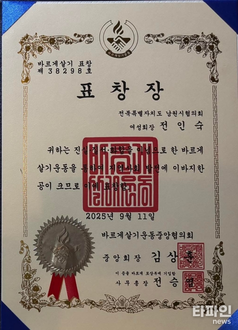 전인숙 회장과 방진복 부회장의 수상은 남원시 바르게살기운동의 오랜 활동이 전국적으로 인정받은 사례로, 지역공동체 강화와 시민의식 함양에도 큰 동력이 될 것으로 기대된다.
