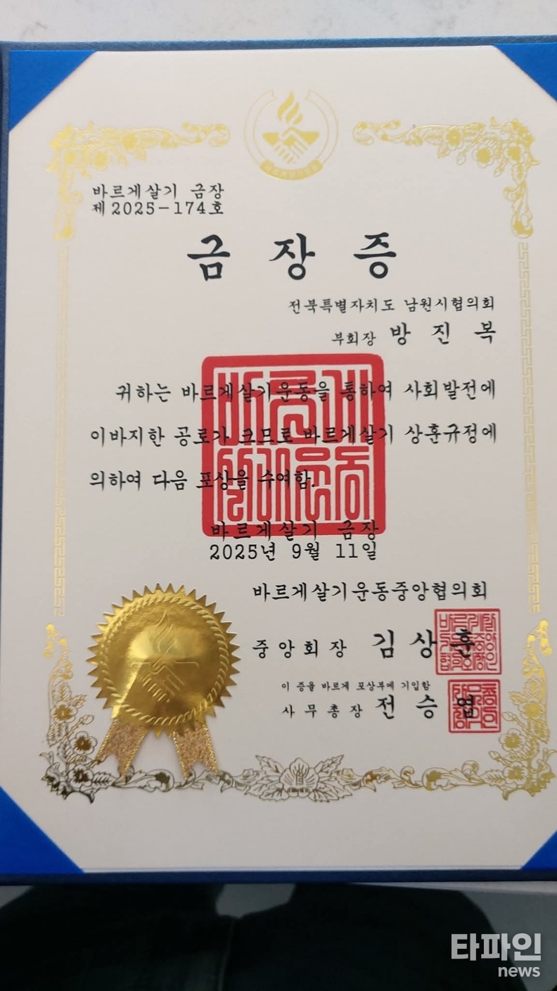 방진복 바르게살기운동 남원시협의회 부회장은 바르게살기운동 중앙협의회로부터 금장을 받았다.