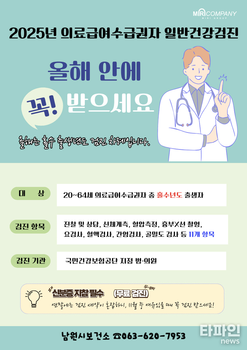 남원시보건소는 “올해는 20세부터 64세까지의 홀수년도 출생자 전원이 무료 건강검진 대상”이라며, “연말까지 기간이 얼마 남지 않은 만큼, 조속히 검진을 완료해 달라”고 당부했다.