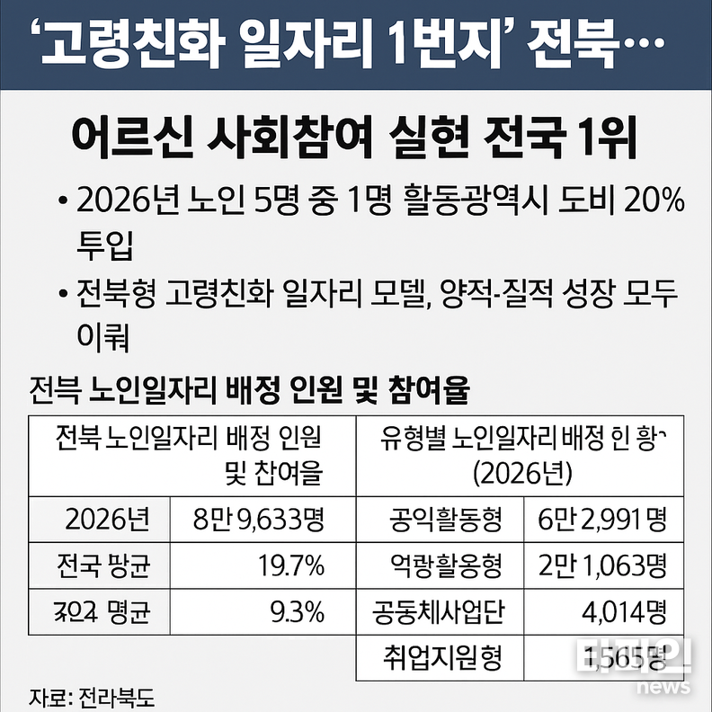 18일 전북자치도에 따르면 2026년 노인일자리 참여 인원은 8만 9,633명으로 65세 이상 노인 인구 45만 4,045명 대비 참여율 19.7%를 기록했다고 밝혔다.