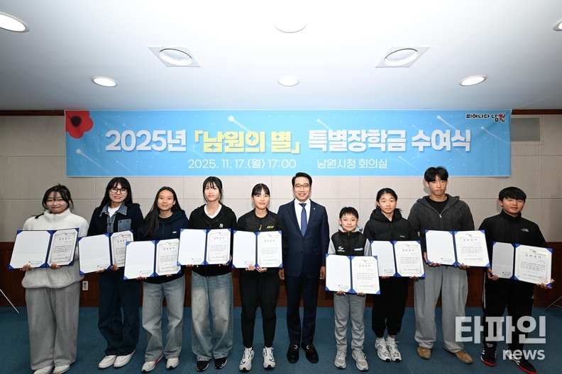 (남원=타파인) 이상선 기자 = 춘향장학재단(이사장 최경식)은 지난 17일 남원시청 회의실에서 ‘2025년 남원의 별 특별장학금 수여식’을 열고, 예체능 분야에서 우수한 성과를 거둔 지역 인재 16명에게 장학금을 전달했다고 밝혔다.