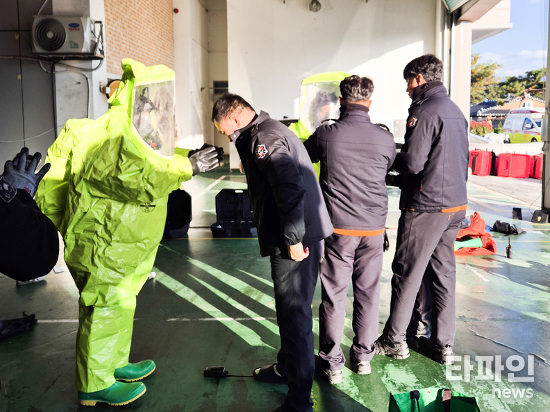 이어 진행된 실습에서는 보건소 초동대응요원들이 개인보호복(Level A) 착·탈의, 공기호흡기 사용법, 오염 현장 대응 절차 등을 직접 수행하며 실제상황을 가정한 훈련을 진행했다.
