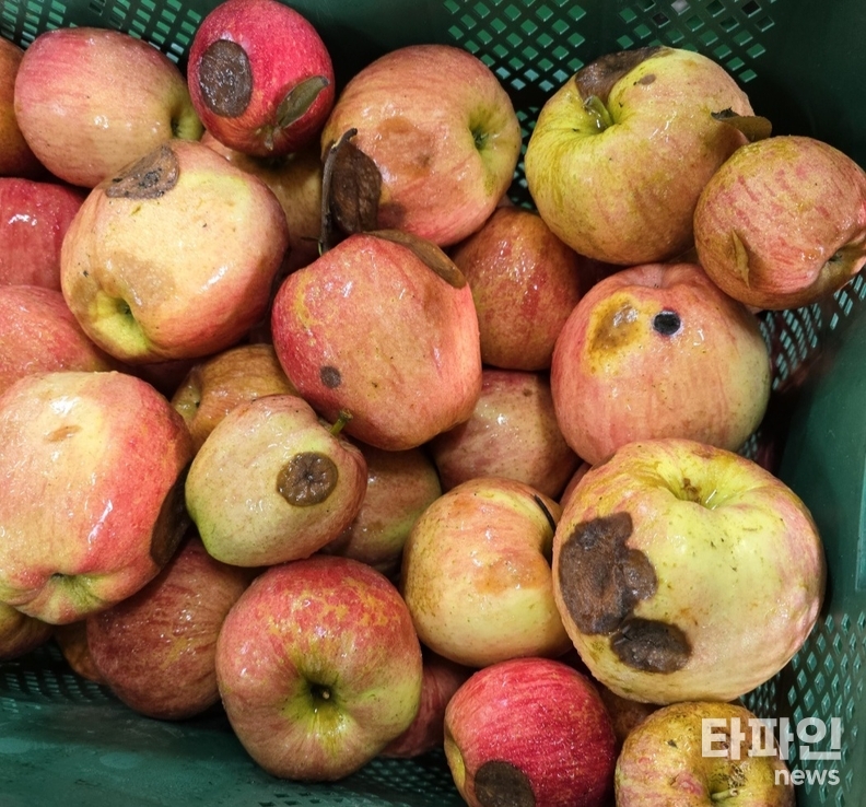 본지가 확인한 사진 속 사과들에는 ▲검은 원형 반점 ▲함몰·갈변된 조직 ▲깊은 내부 부패가 넓게 퍼져 있다.
