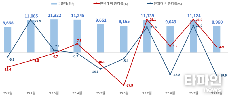지역별 수출은 중동·북미를 제외하고 전반적으로 감소했지만, 미국향 수출은 8,960만 달러(4.9% 증가)로 유일한 성장세를 보였다.