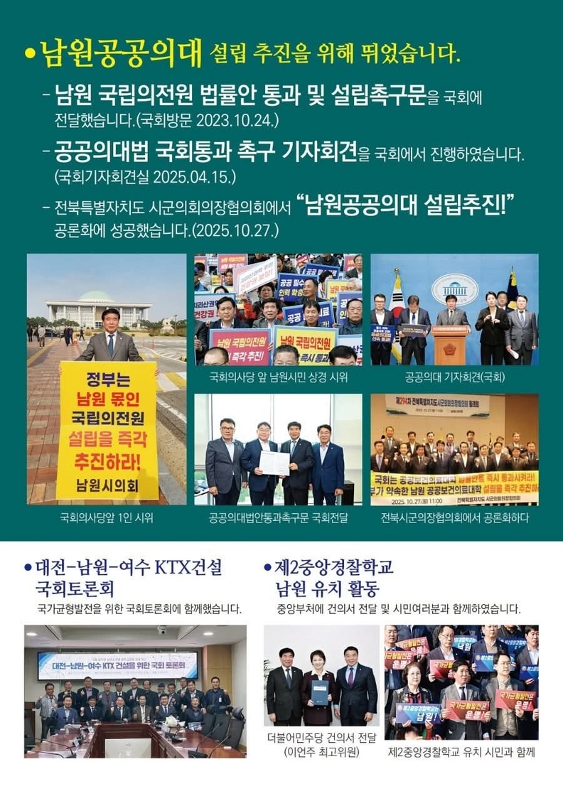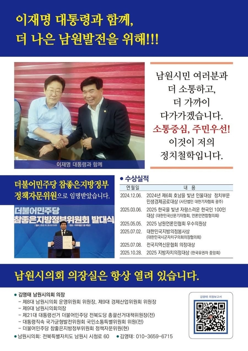 또한 김 의장은 지난 1년간의 의정활동을 ‘시민소통 강화’와 ‘남원의 미래기반 다지기’로 요약하며, 지역경제·생활 SOC·문화·교육 등 다양한 분야에서 남원시의 지속 가능한 발전을 위해 의정 역량을 집중해왔다고 설명했다.