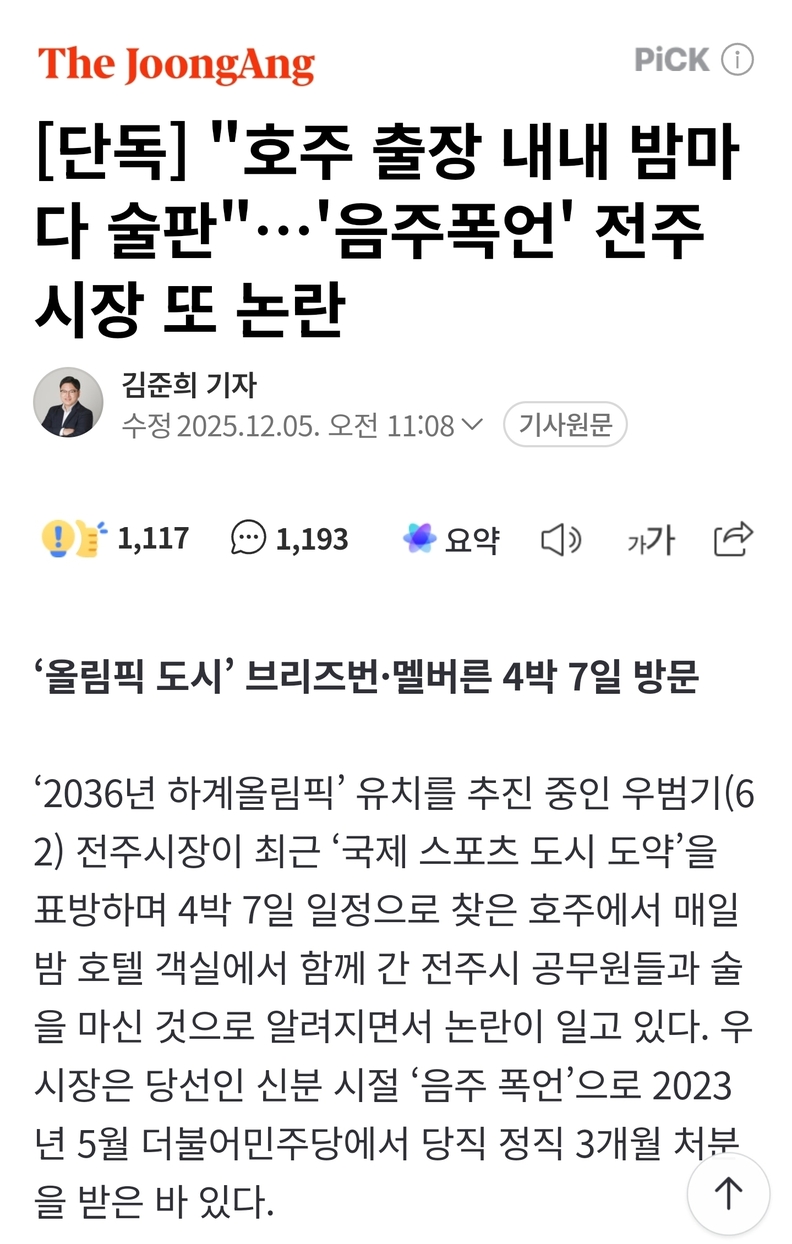 하지만 참여자치전북시민연대는 “과거 음주 폭언으로 징계를 받았던 시장이 해외 출장에서도 비슷한 행태를 보였다”며, “2036년 올림픽 유치를 핑계로 한 외유에 가깝다”고 비판했다.