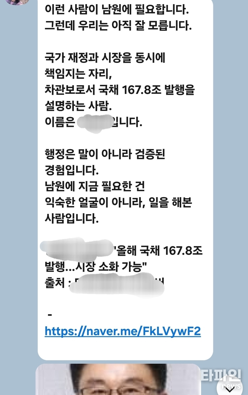 기획재정부 출신 인사의 과거 발언과 경력을 꺼내 “국가 재정도 다뤘던 사람이니 지역 예산도 잘 챙길 것”이라는 식의 기대를 부추기는 방식이다.