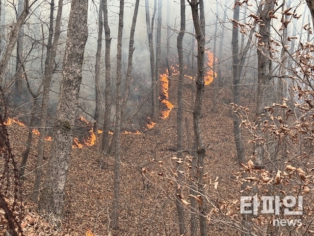22일 서부지방산림청에 따르면 강풍을 타고 확산된 불길이 밤을 넘어 낮까지 이어지면서 산림 당국이 총력 대응에 나섰다.