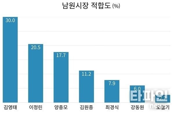 김영태 의장은 전북제일신문 의뢰로 여론조사기관 데일리리서치가 2월 20일 남원시에 거주하는 만 18세 이상 남녀 703명을 대상으로 실시한 조사에서 차기 남원시장 후보 지지도 30.0%를 기록하며 1위를 차지했다.