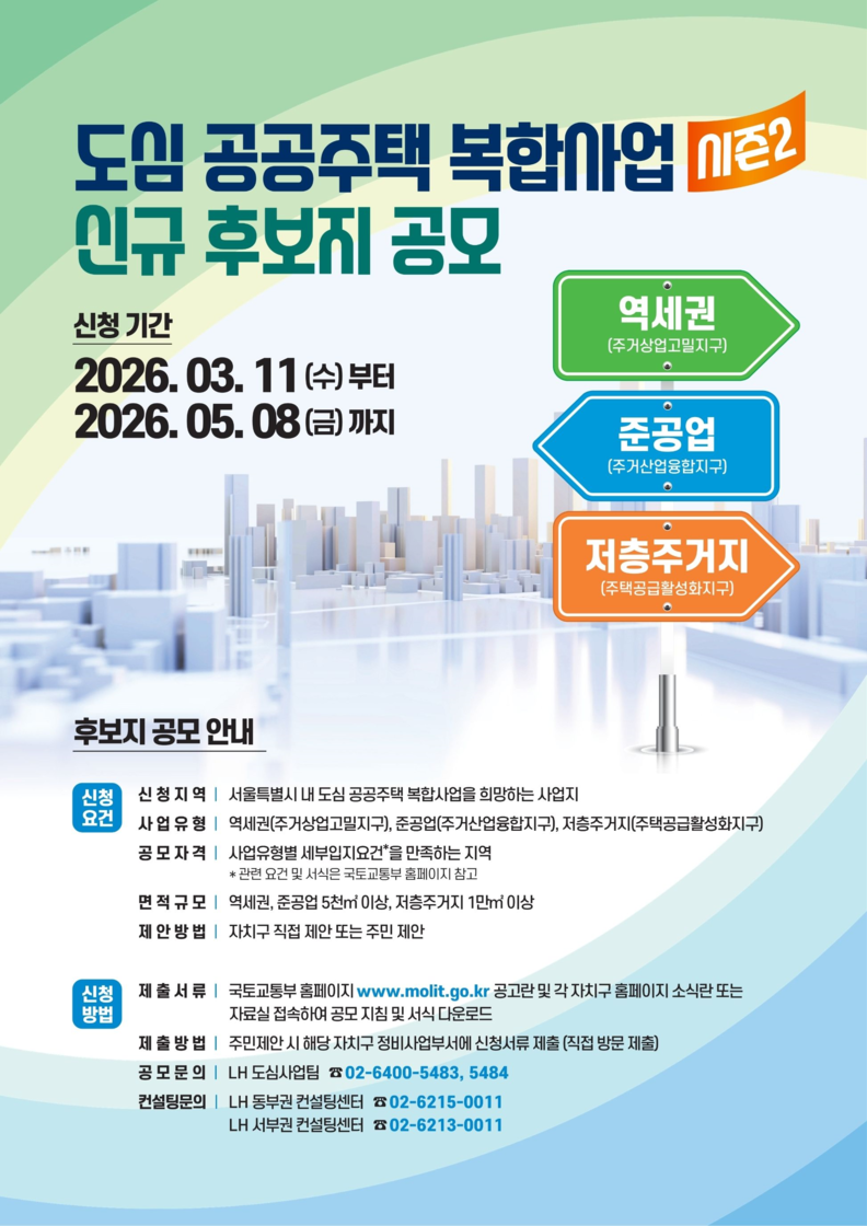 국토교통부는 노후 도심 내 주택 공급 확대를 위해 ‘도심 공공주택 복합사업’ 신규 후보지 공모를 오는 3월 11일부터 시작한다고 밝혔다.