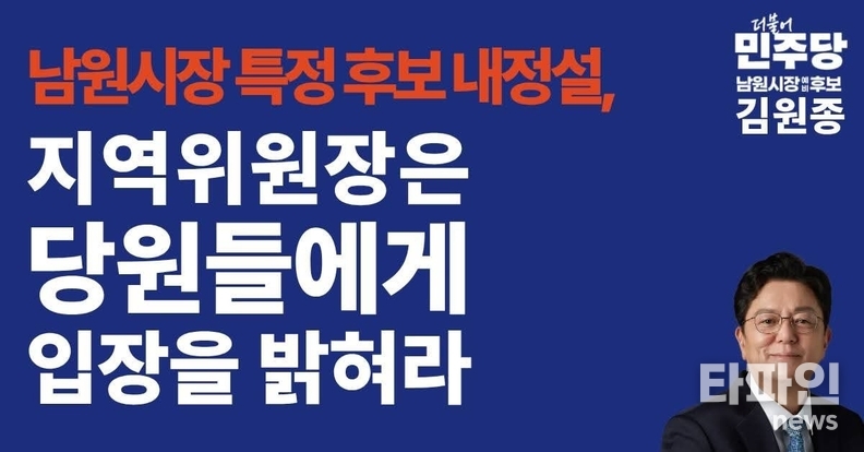 (남원=타파인) 이상선 기자 = 김원종 남원시장 예비후보가 더불어민주당 남원시장 경선을 둘러싼 ‘특정후보 내정설’ 의혹과 관련해 박희승 지역위원장의 공개 입장 표명을 강하게 촉구하고 나섰다.