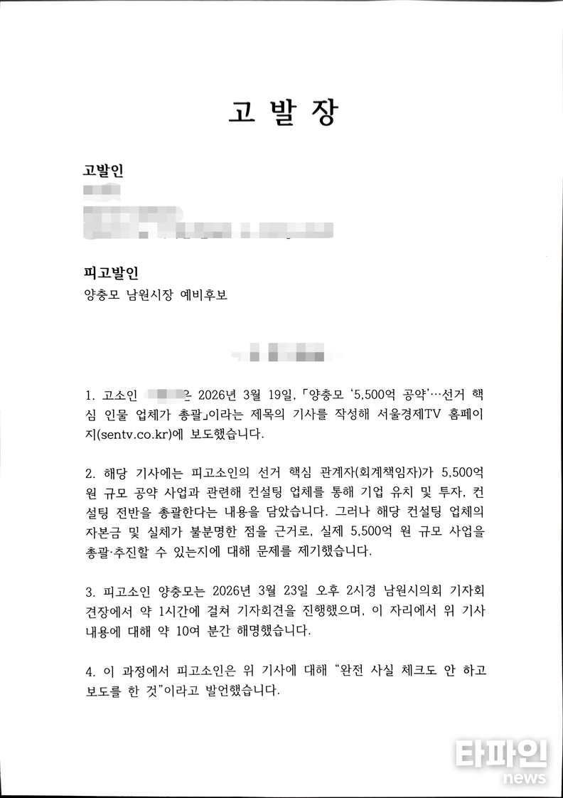 (남원=타파인) 이상선 기자 = A 기자가 양충모 남원시장 예비후보를 상대로 허위사실 공표 혐의와 관련해 선거관리위원회에 고발장을 제출했다. [사설] “5500억 공약, 근거는 빈칸”…양충모 후보, 남원시민 상대로 ‘위험한 실험’ 하나