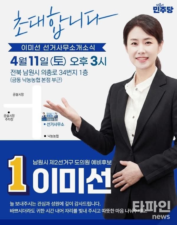 (남원=타파인) 이상선 기자 = 이미선 남원시 제2선거구 도의원 예비후보가 오는 11일 오후 3시 남원시 금동 280-8에서 선거사무소 개소식을 열고 본격적인 선거 행보에 나선다.