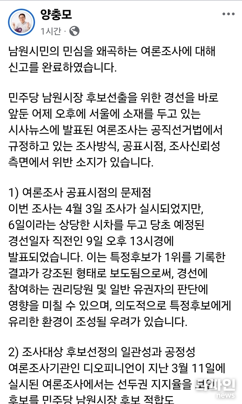 10일 양충모 후보는 자신의 페이스북을 통해 특정 여론조사를 문제 삼으며 “민심 왜곡”, “공정성 훼손”, “조사 신뢰성 부족” 등을 주장하고 있다.
