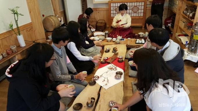 | 지난 해 11월 예가람길 골목투어 ‘미션을 수행하라’ 차마실에서 ‘우리차의 멋과 향기’다도 체험을 하고 있는 학생들 |