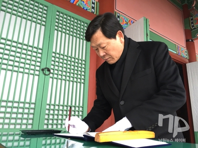 | 강동원 의원이 선관위에 예비후보를 마치고 남원 만인의총을 참배하고 있다. |