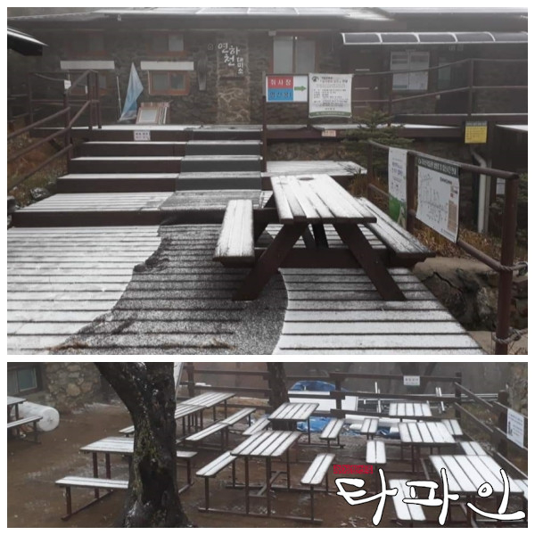 ▲지난 10월 27일 오전 9시께 지리산국립공원 북부사무소 손영조 탐방시설 과장 페이스북을 통해 지리산 연하천 첫눈 소식을 전했다.(손영조 과장 페북 갈무리)