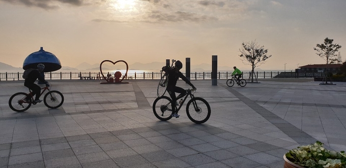 ▲지난 2일 오전 8시 40분께 2018년 제6회 여수시 여자만 전국 산악·해안 MTB 랠리에 참가한 동신스캇팀 김병수(남원용성고2) 학생이 출발전 오른쪽 어깨에 로드를 걸치고 몸을 풀고 있다. /이상선기자