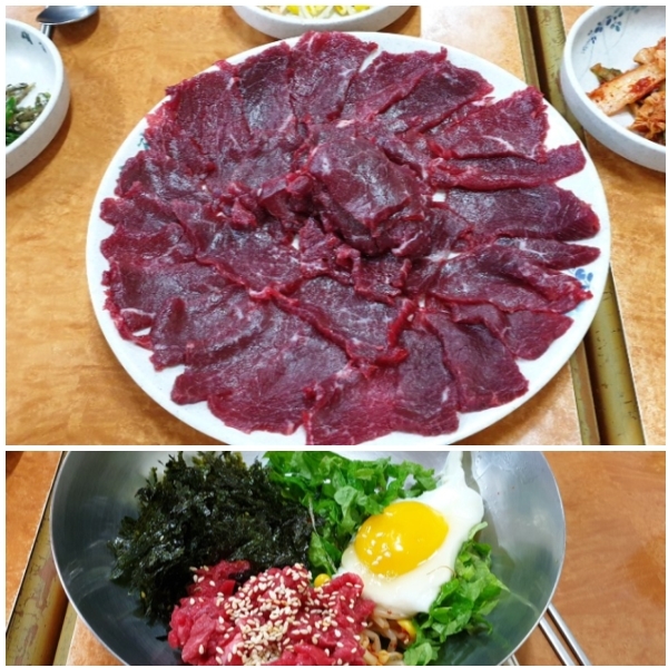 ▲전북 남원 광한루 서문에서 도보로 3분거리에 '내고향 생고기' 정육전문 식당이 추어탕 전문 식당 사이에서 남원맛집으로 명성을 이어가고 있다. 지난 20일 낮 12시께 김용주 남원시 금동장과 이곳에서 점심을 함께하며 남원 육사시미의 역사를 들을 수 있었다. 김 동장은 '내고향 생고기' 식당의 육사시미가 상급이며, 가격 또한 착한 가격이라고 말했다. 육사시미와 육회(대 35,000원), 육회비빔밥(돌솥밥 포함 8,000원) 등을 주력으로 팔고 있다. 추어탕이 유명한 남원에서 생고기집이 생소할 수 있지만, 남원은 역사적으로 고증받을 정도로 육사시미가 유명했던 곳이다. /이상선 기자