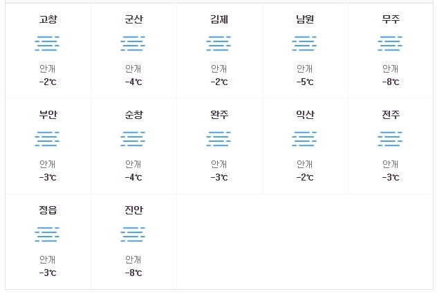 이날 낮 최고 기온은 남원과 전주, 완주, 순창, 익산, 부안이 영상 4도, 임실과 정읍, 군산, 김제, 고창이 영상 3도, 무주와 진안, 장수가 영상 2도로 예보했다.
