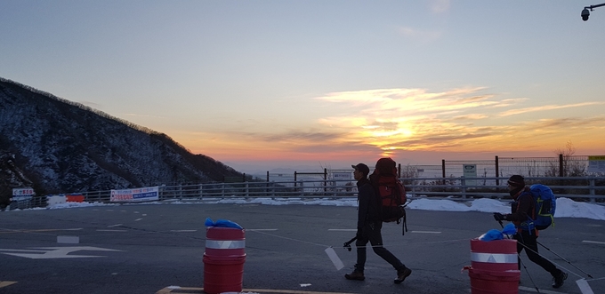▲16일 오전 9시 30분께부터 전북 남원시 주천면 용궁리를 출발해 오후 5시 37분께 지리산국립공원 성삼재에 도착한 남원 동신스캇팀 짐승남들. /최봉오 기자