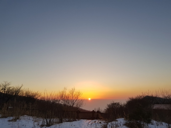 23일 오후 5시 57분께 지리산국립공원 노고단산장 근처 석양이 붉게 물들었다. 이날 전북 남원을 출발 지리산 종주에 나선 자전거 동신스캇팀 박석규, 유규홍, 최봉오씨는 장장 11시간 18분 33초를 걸었다. 이들이 눈을 헤치며 걸은 지리산 산행코스는 남원 인월면 월평리를 출발해 바래봉-큰고리봉-정령치-만복대-작은고리봉-성삼재-노고단산장 등이다. /최봉오 기자