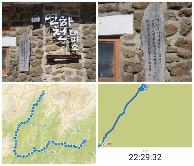 ▲24일 오전 11시 50분께 지리산국립공원 연하천대피소. 전북 남원시 인월면 월평리를 출발한 지리산 종주 동신스캇팀은 첫째날 23일엔 11시간 18분 33초를 걸었다. 둘째날인 24일 장터목대피소(오후6시께 도착)까지 이들이 걸은 거리는 무려 55km로 이틀동안 22시간 29분 32초을 걸었다. 사진속 연하천대피소 시구를 옮겨본다. '그대는 나날이 변덕스럽지만, 지리산은 변하면서도 언제나 첫 마음이니, 행여 견딜만 하다면 제발 오지마시라.' /사진=최봉오 기자