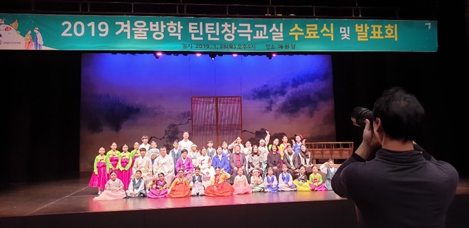 ▲2019년 1월 26일 오후4시에 전북 남원시에서 열린 2019 겨울방학 틴틴창극교실 수료식 및 발표회에서 참가자들이 기념촬영을 하고 있다. /사진=이상선 기자