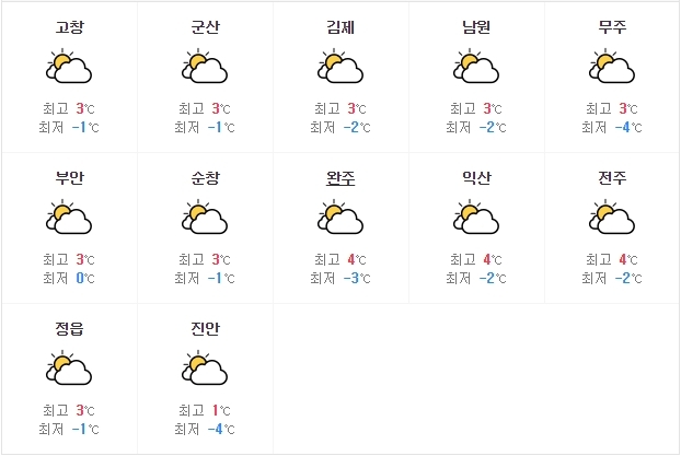 16일 아침 최저 기온은 무주와 진안, 장수, 임실이 영하 4도, 완주는 영하 3도, 남원과 전주, 익산, 정읍, 김제가 영하 2도, 순창과 군산, 부안, 고창은 영하 1도로 전날보다 높겠다.