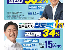 (전북=타파인) 이상선 기자 = 6·3 제9회 전국동시지방선거를 5개월여 앞두고 실시된 신년 여론조사에서 전북 정치지형은 분명한 대비를 드러냈다. 전북도지사 선거에서는 김관영 지사가 30%대 중반의 지지율로 선두를 유지하며 비교적 안정적인 흐름을 이어간 반면, 14개 시·군 기초단체장 선거는 지역별로 과반 독주와 초접전, 현직 공백에 따른 판 재편이 동시에 관측됐다. 광역은 ‘유지’, 기초는 ‘요동’이라는 한 문장으로 요약되는 결과다. 전북도지사 선호도 조사에서 김관영 지사는 34%로 1위를 기록했다. 이원택 의원 19%, 안호영 의원 13%, 정헌율 익산시장 5%가 뒤를 이었고, ‘없음·결정 못함·무응답’이 29%에 달했다. 전국적으로 민주당 현직 광역단체장들이 30%대를 넘기기 쉽지 않은 흐름 속에서 김 지사의 수치는 상대적으로 두드러진다는 평가가 나온다. 다만 유보층 비중이 적지 않아 경선 구도가 가시화될 경우 표심 이동 가능성도 함께 거론된다. 전북의 핵심 도시는 새해부터 혼전이다. 전주시장 적합도 조사에서 조지훈 더불어민주당 원내대표 특보가 22.5%로 선두에 섰지만, 우범기 현 전주시장이 20.5%로 바짝 추격해 격차는 2.0%p에 그쳤다. 임정엽